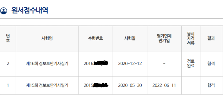 · 다음 예시 이미지와 같이 시험명, 수험번호, 시험일, 합격결과가 모두 보이는 원서접수 내역(혹은 합격결과)을 첨부해주세요.